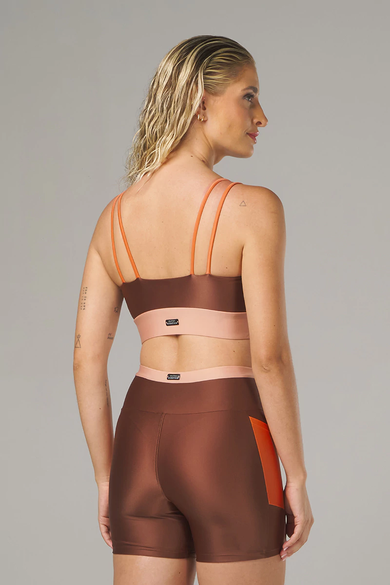 Já o Top possui alças duplas finas e elástico interno, ele oferece a sustentação ideal. O decote arredondado traz leveza, enquanto os recortes estratégicos valorizam o busto de forma natural, seguindo o contorno do seu corpo como se fosse feito sob medida.