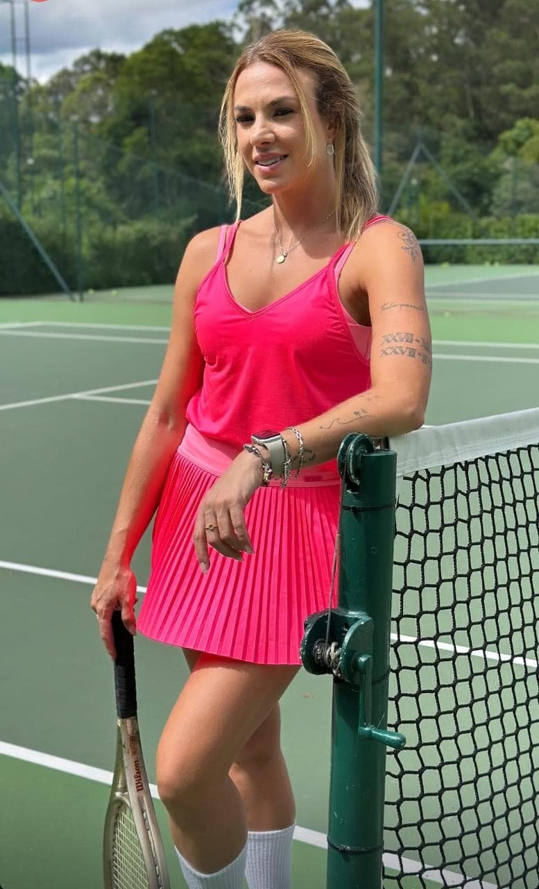 Ambos feitos no mesmo tecido dry furadinho e nos mesmos tons, criando um look harmonioso e estiloso.