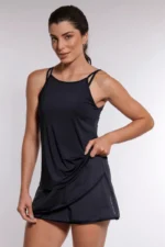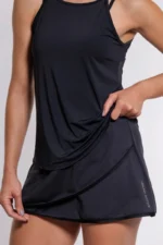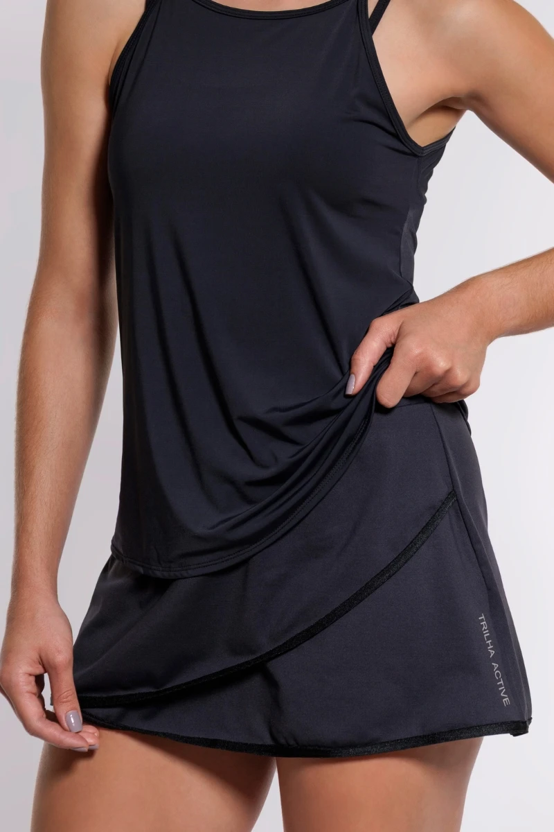 Shorts-saia esportivo com bolso interno e frente com detalhe transpassado, de caimento reto em modelagem que não aperta.